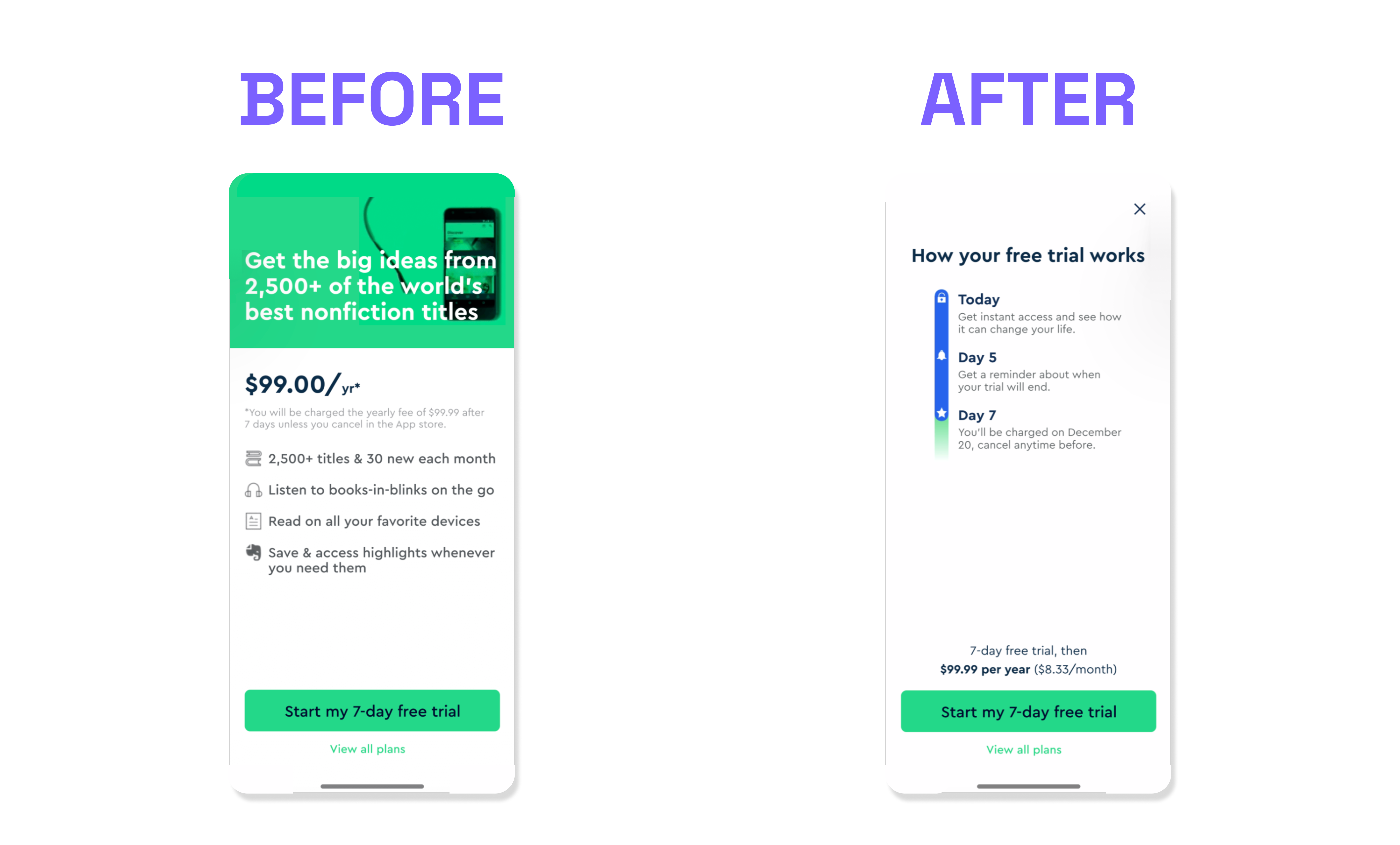 To counter this Blinkist came up with a new concept, one that clearly explained how their trial worked, and importantly, that they would receive a reminder 2 days before their trial ended so they were sure not to forgot to cancel.