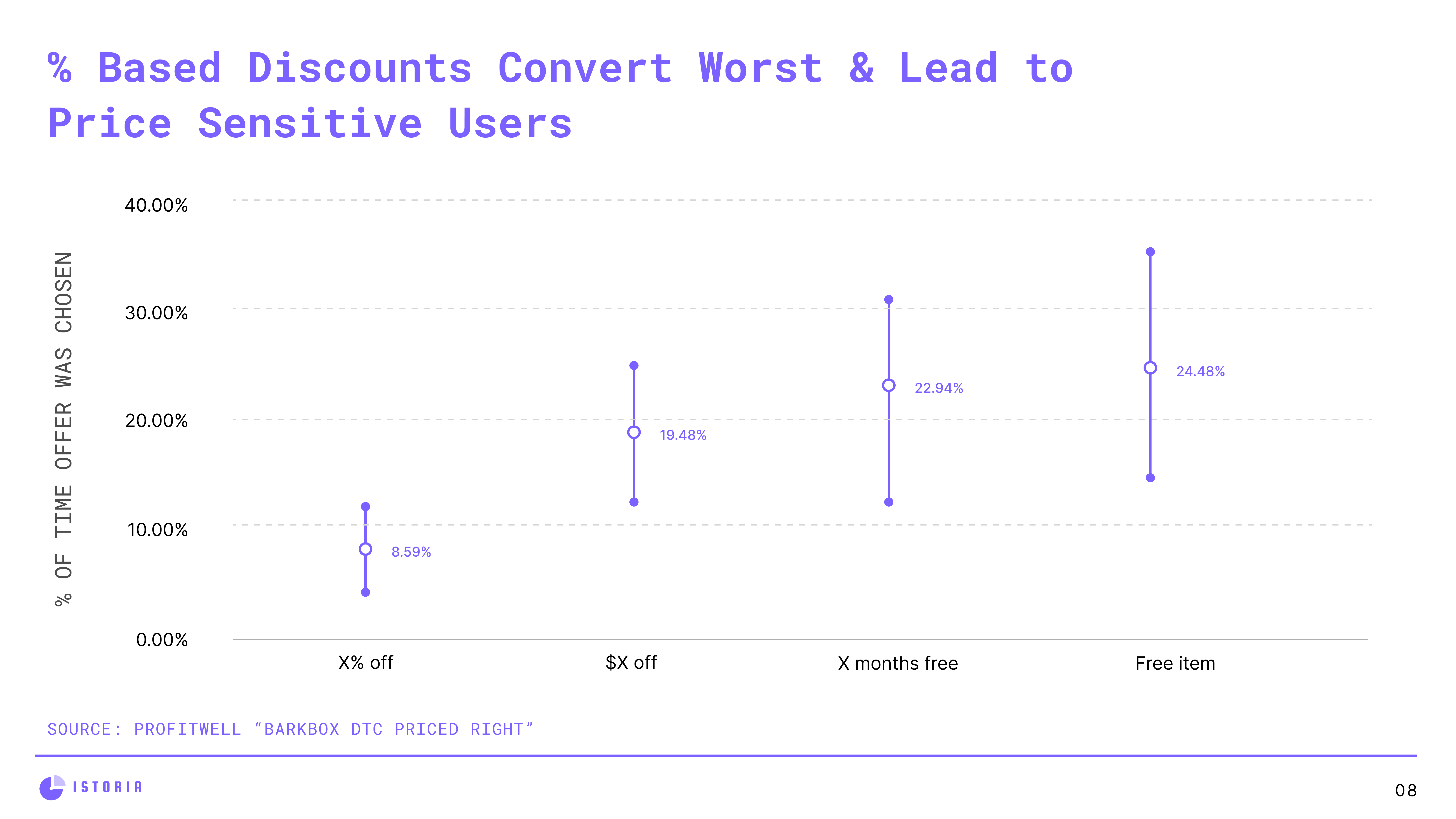 As humans we don’t like maths. The reason this matters is that because when evaluating how good a deal something is a %-based discount is far less tangible than offering dollars or months off, or a free item.